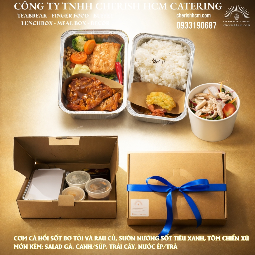 231025 Lunch Box - Juicy Cơm Cá hồi sốt bơ tỏi rau củ, Sườn nướng sốt tiêu xanh/ Salmon with Garlic Butter Sauce and Vegetables, Grilled Pork with Green Pepper Sauce