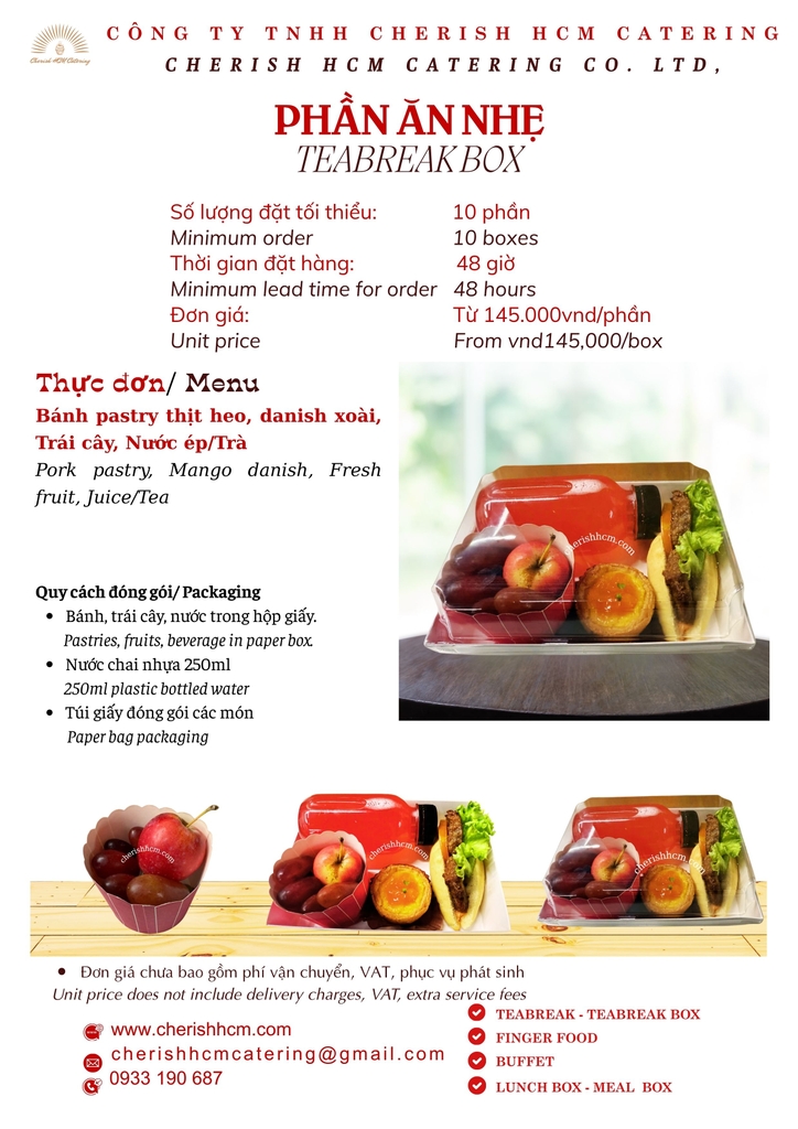 Teabreak Box Travel- 2 Bánh mặn, ngọt, trái cây, nước/ 2 Pastries, Fresh fruit, Juice/Tea