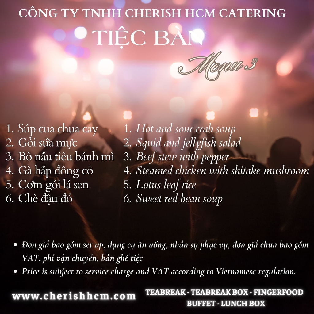Tiệc bao gồm: Trang thiết bị tiệc bàn tiệc (chén sứ,thìa, đũa, ly thủy tinh….). Khăn bàn, trang trí bàn tiệc, giấy ăn, khăn lạnh. Nhân viên phục vụ (trang trọng, chuyên nghiệp). Dọn sau khi kết thúc tiệc. Quý khách đặt từ 5 bàn, tặng...